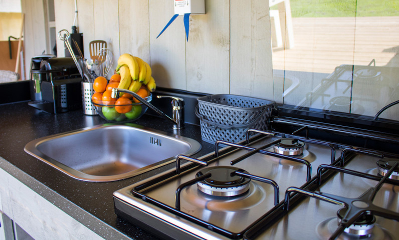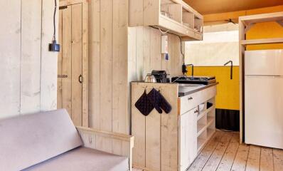 Découvrez notre nouveauté : la tente Lodge Prestige Plus entièrement équipée. Avec une salle de bain complète, un cadre en bois robuste, et une capacité d’accueil jusqu’à cinq personnes, cette tente spacieuse de 25 m² offre tout le confort nécessaire. Elle comprend des chambres séparées par un mur en bois avec des lits confortables, des meubles, une cuisine complète, et une belle terrasse. Le toit élevé et la façade entièrement ouvrante permettent de profiter pleinement du plein air. Tout ce qu'il vous faut pour une expérience inoubliable !