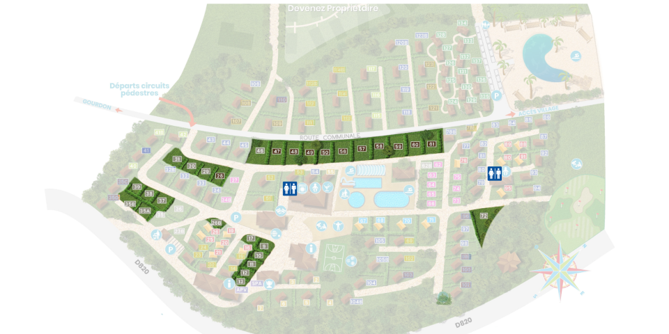 Nos emplacements spacieux (80 m² ou 100 m²) sont délimités par des haies pour vous offrir une certaine intimité, tout en restant proches des commodités principales. -