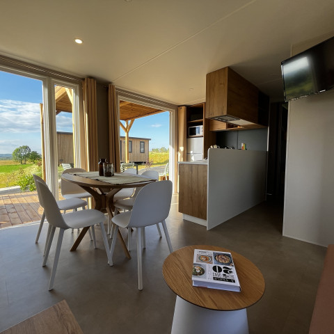 Deze luxueuze stacaravans onderscheiden zich door hun royale ruimte en natuurlijke lichtinval, dankzij een ontwerp dat gericht is op het buitenleven. Geniet van een ruime, lichtovergoten binnenruimte—perfect voor een ontspannen vakantie in alle rust.